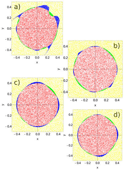 The answer of networks defined by the parameters listed in Table 1 to a testing dataset of 100,000 records. Yellow and red points are classified correctly. The network gives a wrong answer on points marked green (they belong to the sun but are classified as located outside it) and points marked blue (they are located outside the sun but are classified as belonging to the red area). Subfigures (a–d) correspond to networks with parameters listed in lines 1–4 of Table 1, respectively. The accuracy of these networks is (a) 0.957, (b) 0.984, (c) 0.976 and (d) 0.979, respectively.