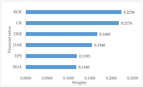Based on the proposed model, the entropy–DEMATEL weights of each financial ratio are determined. As shown in Figure 1, ROE is the most influential financial ratio that affects the companies’ financial performance. ROE obtains the largest weight value with 0.2236 among the financial ratios. The second highest weight is obtained by CR. The weight for CR is 0.2174. Next, DER achieves a weight of 0.1669, followed by DAR (0.1548), EPS (0.1193), and lastly ROA (0.1180).