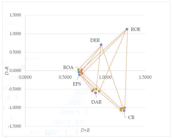 In this study, the financial ratios with positive value of () will be grouped into the cause group. DER has the lowest value of () when compared to ROE in the cause group. DER and ROE have the () values of 0.7026 and 1.1221, respectively. As a result, DER and ROE are classified into the cause criteria group. In contrast, the most significant effect factor is CR, which has the lowest () value, with −1.0797. This indicates that CR plays a significant role in assessing the companies’ financial performance. Next, DAR is ranked the second lowest degree (−0.5976) among all effect factors. EPS is in the third place (−0.1120). Lastly, ROA has the () value of −0.0355. Hence, ROA is placed in the lowest ranking among the effect factors.