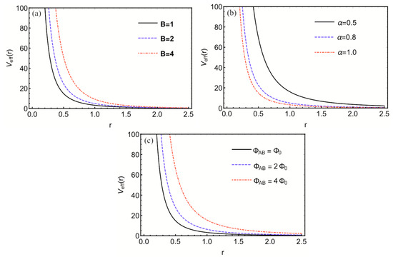 (a) Effective potential when the magnetic field changes. (b) Effective potential when the parameter (topological defect) varies. (c) Effective potential when flux AB varies.