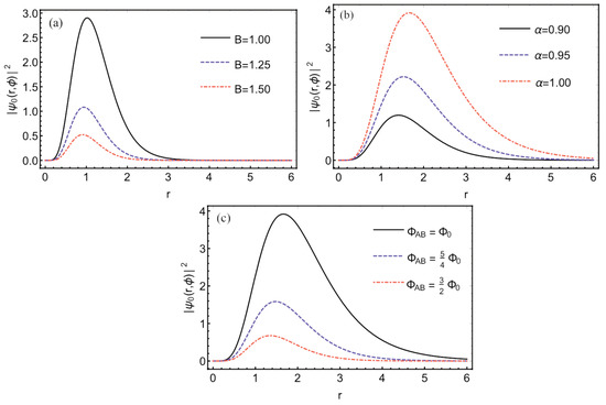 Figure 2 displays the plots of the probability density of the particle confined to the Yukawa interaction (Equation (8)) in the presence of a disclination defect. Note that the wave function profile changes when the magnetic field, the AB flux, and the topological defect change in the theory. Furthermore, when the declination defect (i.e., when ) is changed, the probability density of the wave function translates in its profile so that the highest probability is close to the atomic core. Here it is interesting to mention that the excited eigenstates of the model will have a profile similar to that shown in Figure 2. However, a change in the height of the solitonic wave function can be verified in excited states.