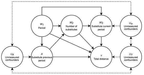 The relationships between these variables are defined as follows; period influences the total distance of team Y, which is known to decline during the match []. As substitutions are highly dependent on the moment of the match; the period has a relationship with the substitutes present , current period substitutions , and substitutions of the previous period A. The total distance of the team Y depends on the number of substitutes present given A and , while substitutions cover more distance than entire-match players. When a substitute occurs within the current period , it leads to a dead ball moment and reduces the overall distance Y. Substitutes in the current period and previous period are also influenced by unknown confounders such as an injury or tactical decisions. The overall distance Y of a team does not solely depend on the period and substitutes, and other possible unknown confounders U in our model are not accounted for but potentially influence the total distance Y [].