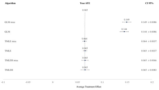 TMLE is known as a double robust estimator, meaning that it is consistent whenever the propensity score model is correctly specified, or the outcome regression is correctly specified []. Although there are other double robust estimators methods, such as the Augmented Inverse Propensity Weighted (AIWP) Estimator, we limit ourselves to one method.