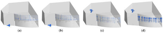 As shown in Figure 8a,b, the flow field of the “Top-supply down-return type window-attached-jet” air supply method is approximately the same as that of the “Top-supply down-return type vertical jet” air supply method. Obviously, the airflow first moves down the windscreen and then gradually towards the rear of the cockpit, forming vortices at the dead ends on the left and right sides and eventually exiting through the lower exhaust air outlet. The difference is that the airflow is more closely aligned with the windscreen in the “Top-supply down-return type window-attached-jet” ventilation system than in the “Top-supply down-return type vertical jet” ventilation system.