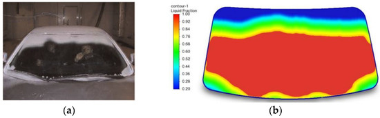 To ensure the reliability of the simulation method in this paper, the experimental results of defrosting in the literature [18,19] were used for comparison with the numerical simulation results, where the model dimensions of the computational domain are 3.1 m × 1.8 m × 1.2 m (length × width × height), and the windscreen thickness is 4.96 mm, as shown in Figure 3. Assume uniform frost on the outside surface of the windscreen, an ambient temperature of −18 °C, and a frost layer thickness of 0.5 mm. A comparison of the experimental and simulated results of defrosting at 20 min is shown in Figure 4.