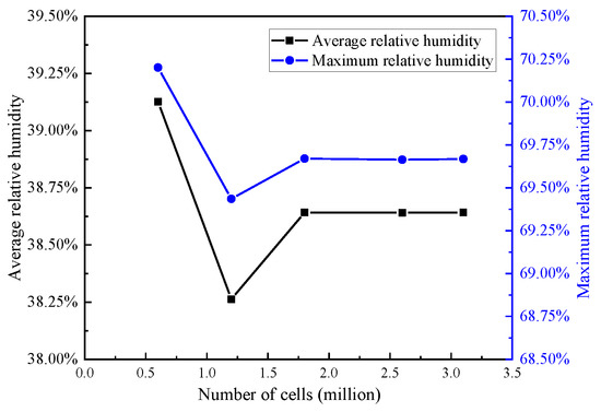 As shown in Figure 6, when the number of cells was larger than 1.8 million, the average relative humidity and the maximum relative humidity of the windscreen surface tended to be stable and did not change significantly with the number of cells. Therefore, a mesh of 1.8 million was employed for the numerical simulation in this paper, while ensuring the accuracy of the mesh and considering the computational cost.