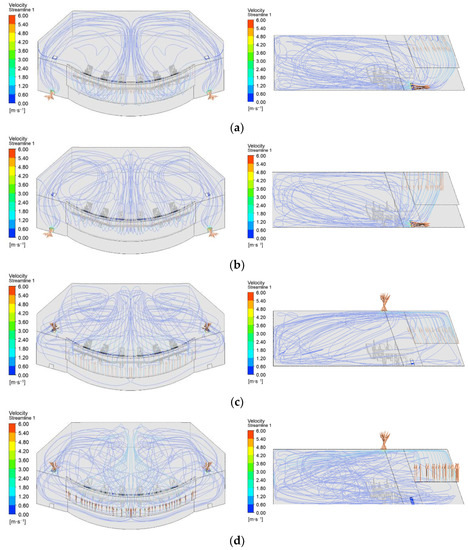 As shown in Figure 8c,d, the flow field of the “Down-supply up-return type window-attached-jet” and “Down-supply up-return type vertical jet” air supply methods differ significantly from the flow fields of the previous two air supply methods, and the streamlines are quite chaotic.