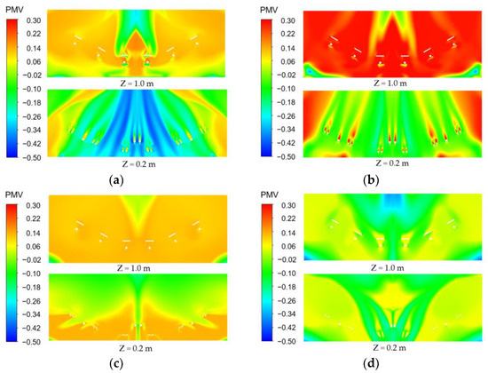 PMV value distribution under different air supply methods. (a) Top-supply down-return type window-attached-jet (TSDR-WAJ); (b) Top-supply down-return type vertical jet (TSDR-VJ); (c) Down-supply up-return type window-attached-jet (DSUR-WAJ); (d) Down-supply up-return type vertical jet (DSUR-VJ).