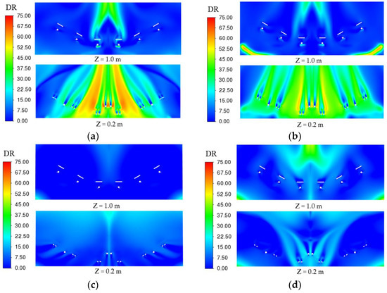 DR value distribution under different air supply methods. (a) Top-supply down-return type window-attached-jet (TSDR-WAJ); (b) Top-supply down-return type vertical jet (TSDR-VJ); (c) Down-supply up-return type window-attached-jet (DSUR-WAJ); (d) Down-supply up-return type vertical jet (DSUR-VJ).