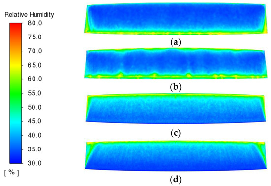 Relative humidity distribution under different air supply methods. (a) Top-supply down-return type window-attached-jet (TSDR-WAJ); (b) Top-supply down-return type vertical jet (TSDR-VJ); (c) Down-supply up-return type window-attached-jet (DSUR-WAJ); (d) Down-supply up-return type vertical jet (DSUR-VJ).