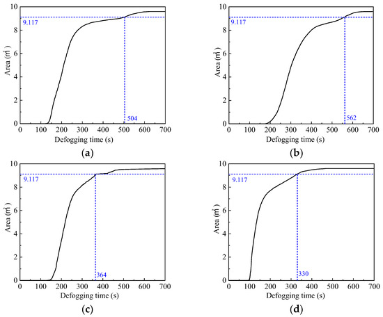 The whole windscreen area is 19.194 m2, and half of the windscreen area is 9.597 m2. The basic requirements of defogging are considered to be met when the defogging area is greater than 9.117 m2. As can be seen from Figure 12, the “Down-supply up-return type vertical jet” air supply method has the best defogging effect, reaching the defogging requirement at 330 s. The “Top-supply down-return type vertical jet” air supply method is the least effective, with a defogging time of 562 s. Therefore, the “Down-supply up-return type vertical jet” air supply method is, therefore, the most effective at an air supply velocity of 1 m/s, an air supply temperature of 297 K, and an air supply relative humidity of 30%, thus providing the best guarantee of driving safety.