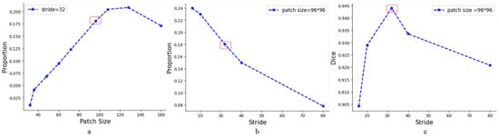 The choice of patch size and stride size. (a) The proportion of patches containing aneurysms with different patch sizes when the stride size is 32. (b) The proportion of patches containing aneurysms with different stride sizes when the patch size is pixel2. (c) The Dice at different stride sizes.