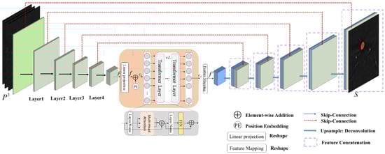 Next, we present a Transformer block comprising repeated Transformer layers to achieve a global context using an attention mechanism. For a given , it is flattened into a vector of size , by a linear projection operation , resulting in , . constitutes the input of the Transformer block, and PE is the learnable position embedding.