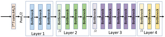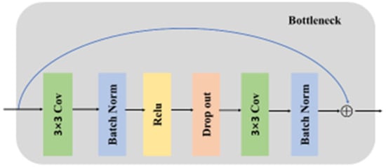 The encoder blocks are composed of ResNet34 and the Transformer block. ResNet34 is mainly composed of a Bottleneck. In order to prevent overfitting, we added a dropout block to the original Bottleneck (see Figure 4). ResNet34 is a type of neural network that captures more deeper features by using skip connections to “skip” a number of convolutional layers in every Bottleneck in the network. The structure of the ResNet34 encoder block is shown in Figure 5.