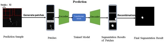 After the training phase, the trained model can only segment images. In the prediction phase (see Figure 6), the input samples were segmented into patches using the sliding window strategy. Then, the trained model generated segmentations of patches. The segmentation maps were recombined to obtain the final segmentation map. The stride was 32, and adjacent patches had overlapping pixels. For each pixel, the average strategy [] is where the aneurysm probability of each pixel is obtained by averaging possibilities over all the predicted patches covering the pixel. This solution will lose a lot of detail and is time-consuming. We propose a new recombination strategy.