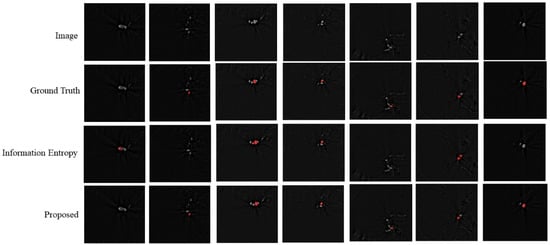 In the data preprocessing, the gradient entropy sampling strategy was implemented to generate a sufficient number of training patches from the limited images. We compared the traditional entropy sampling strategy with our strategy, and the result is shown in Table 2. The visual result is shown in Figure 9. The last row shows the segmentation of our method, where the segmentation is almost the same as the ground truth. As shown in Figure 9, our gradient entropy sampling strategy can better distinguish vessels and aneurysms. It is easy for information entropy sampling selection to produce false positives, and it has poor segmentation performance concerning smaller aneurysms.