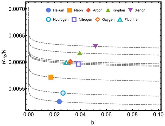Rényi’s entropy per particle being for the typical van der Waals values and versus b. One considers the noble gases helium, neon, argon, krypton, and xenon, and also, hydrogen, nitrogen, oxygen, and fluorine. The numerical values of a and b are given in the table of Ref. [16]. The lines are visual aids representing virtual trajectories as b varies.