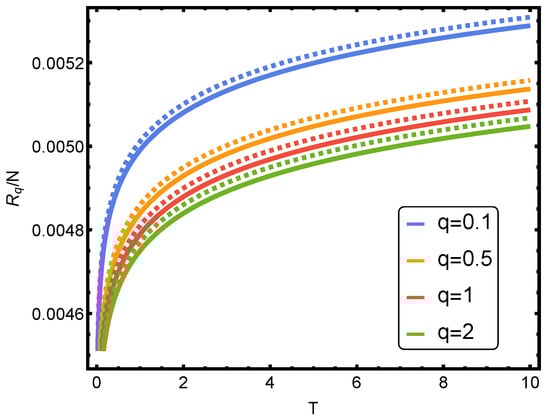 Rényi’s entropy per particle versus temperature T for several values of q. One takes . The solid curve corresponds to (vdW case) and the dashed curve to (ideal case). The numerical value of b is of the helium, obtained in the table of Ref. [16].