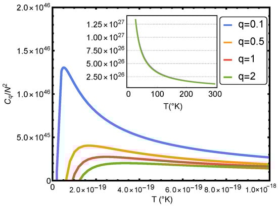 One appreciates the shape of in Figure 3. The complexity reaches its maximum value near and approaches zero as T approaches infinity, as one sees in the figure. Of course, the complexity diminishes as T augments and grows when the particle number increases (see Figure 3). The complexity grows as q decreases. Its maximum corresponds to temperatures for which the classical treatment is no longer valid. This last statement is carefully investigated in Ref. [15].
