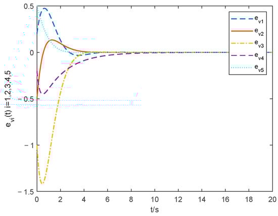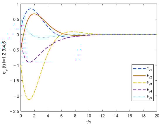 The choice of parameter settings of the proposed controller is shown below: , , , and . The simulations of the consensus error curve are seen in Figure 4, Figure 5, Figure 6 and Figure 7. Figure 4 and Figure 5 show the state tracking errors of followers by the controller proposed in this paper. Figure 6 and Figure 7 show the state tracking errors of followers by the protocol in [40]. It can be seen that the tracking error of the position and velocity variables can converge to zero within a finite time by using the controller outlined in this paper. From the comparison of Figure 4 and Figure 5 with Figure 6 and Figure 7, the settling time with the controller in this paper is about 6 s, while that with the protocol in [40] is about 11 s. The overshoot is smaller, and the convergence speed is faster of the curve based on the controller proposed in this paper than that in [40], which proves the superiority of our proposed controller.
