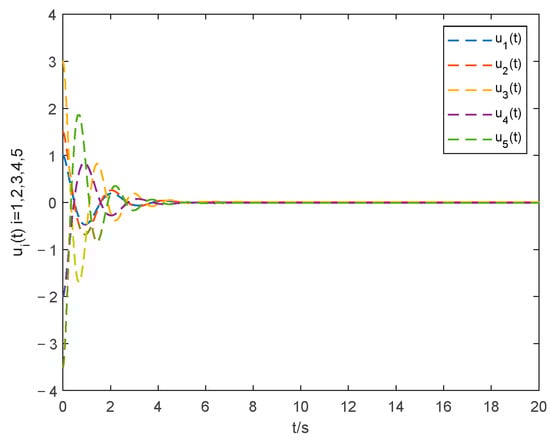 From the above simulation comparison results, the proposed controller can effectively solve the problem of chattering, while the controller in [40] cannot. Consequently, the control method proposed in this paper has an improved robustness and can realize rapid and accurate control of consensus.
