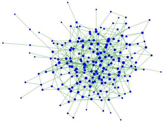 We generate random networks of the Erdős–Rényi type with N nodes [20,21]. The Erdős–Rényi type of network, also called random network, is a network type in which any two nodes are connected with a pre-defined probability, p. Thus, when constructed, each node is connected to a number of nodes, where is the degree of node i. A characteristic value of the network is , the average degree of all nodes of the network. The probability distribution of the k nodes results in a Poisson distribution. In Figure 1 we present a typical network of this type. We expect that the nodes with the higher degree would be the most central and the most connected nodes in the network. However, the degree of the nearest neighbors of each node is equally important. As stated in [22], the k-shell of a node reveals how central this node is in the network with respect to its neighbors, meaning that a higher k-value signifies a more central node belonging to a more connected neighborhood in the network.