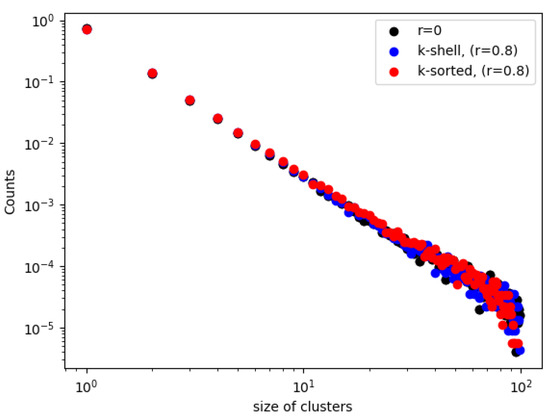 The distribution of the sizes of the clusters of Figure 2 are plotted in Figure 4 (for and for ). We observe in Figure 4, when the removal probabilities are the same for both zones, that the distributions are identical (black dots). When the inner zone has a smaller probability than the outer zone, then there is just a small difference, where there are slightly more small sized clusters in the k-shell than in the k-sorted model, which agrees with the results of Figure 2. However, this difference is within statistical error. However, it is interesting to see that there exists a very good linear relationships in the log–log plots, which means that all these distributions follow a nice power law form, for both models. We calculate the slope of the straight lines in Figure 3 to be −2.37 (black), −2.29 (blue) and −2.34 (red). Surprisingly, within statistical error, the slopes of the cluster size distribution for the two cases, with zones of different probabilities, and without any zones, are similar when the network breaks down. This implies that depleting zones with different probabilities plays no role in the fragments that are broken off the main body of the network at the critical point exactly when a spanning cluster ceases to exist.