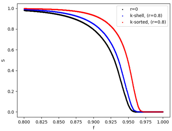 Relative size of the largest cluster S during the entire removal process for the two models, for and , as a fraction of the removed nodes. For the values of S for the two models do overlap (black, bottom line). For we observe 2 distinct curves for the k-shell (blue, middle line ) and the k-sorted model (red, top line). The networks have size and .