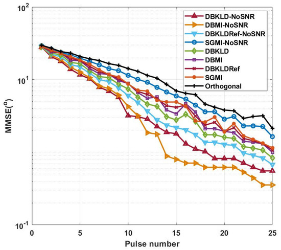 At the initial moment of the simulation, the MMSE of the target parameter is 30°, and under the multi-hypothesis probability iterations, the MMSE of the target parameter is reduced at a high rate. The DBKLD-NoSNR waveform exhibits better performance before the 11th pulse, with a high decline rate, which results from the fact that the KLD criterion rapidly separates the distance between probabilities. Nonetheless, from the perspective of parameter estimation, the KLD criterion is inferior to the MI criterion, and this finding is in accordance with [28]. At the 25th pulse, the target parameter MMSE of the orthogonal waveform reaches 2°, while the target parameter MMSE of the DBMI-NoSNR waveform can reach 0.35°. The DBMI-NoSNR and DBKLD-NoSNR waveforms proposed in this paper outperform the DBKLDRef-NoSNR waveform [17].