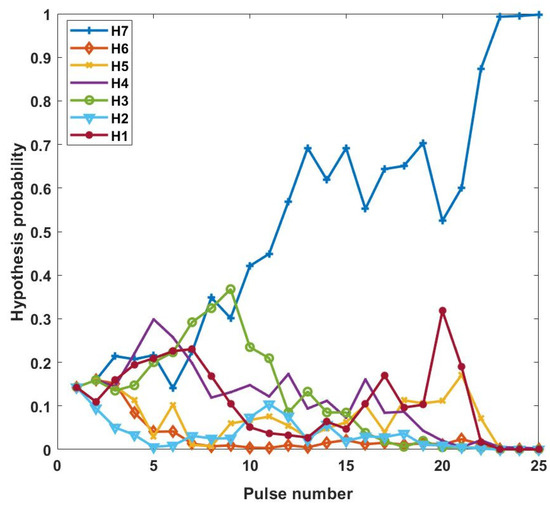 The initial transmission waveform is designed without prior information, and the parameter is estimated based on the first echo signal. As the waveform is adaptively adjusted, the probability of each hypothesis is updated with change in the output data. Through the simulation, the DBMI-NoSNR waveform achieves a correct decision hypothesis when transmitting the 25th pulse, as shown in Figure 2.