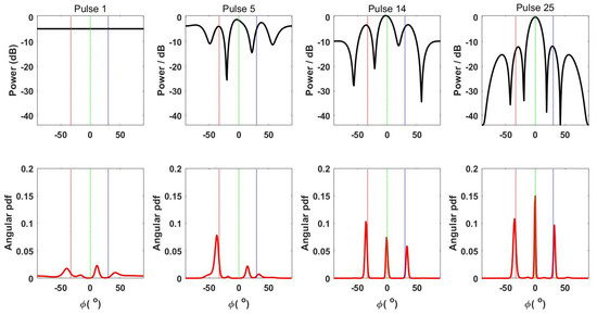 As observed in Figure 2, the probability of each hypothesis fluctuates with increasing pulse number, which is related to the change in the target response covariance matrix in the hypothesis. The estimated parameters change after the transmission of each waveform, thus leading to fluctuations in the probability of each hypothesis. The relations of the DBMI-NoSNR waveform and the corresponding angular PDF with the transmitted pulse number are depicted in Figure 3.