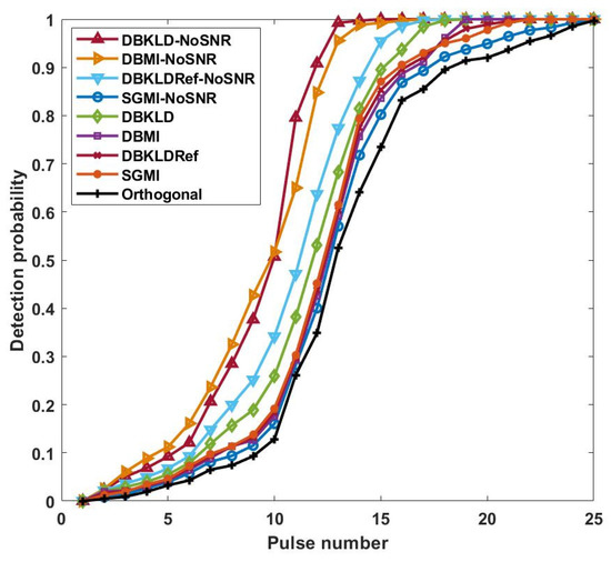 According to Figure 3, with an increase in the pulse number, the targets present a more concentrated probability distribution at three angles: −33°, 0°, and 30°, reaching the maximum probability distribution at pulse number 25. However, when the pulse number is 14, the three targets already show a concentrated angular probability distribution. In this case, the probability of is higher than that of the other hypotheses, approaching 1. Before the 14th pulse, the mean square error of the target parameters changes more sharply with faster improvement in detection performance, suggesting that adaptive waveform design always supersedes changes in the target detection performance and estimation performance. The target detection performance of the nine adaptive waveform types is presented in Figure 4.