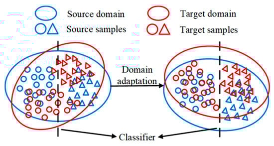 The application of deep learning has developed rapidly in recent years [6,7]. To solve the above problems, deep learning has been widely used in the field of intelligent fault diagnosis and has achieved fruitful results [8]. Janssens et al. [9] used a convolutional neural network (CNN) to automatically extract the fault features of the original signals, avoiding the trouble of manual feature extraction. Zhao et al. [10] embedded a soft threshold denoising module into a deep residual network. The deep learning diagnostic model has improved feature learning capability for strong noise vibration signals. Nevertheless, the improvement of the soft thresholding function embedded in the network needs further discussion. Lei et al. [11] constructed the long-term dependence of time series captured by long- and short-term memory networks. It is applied to wind turbine condition monitoring and fault diagnosis and has achieved great results. Although the deep learning diagnosis method has a strong feature extraction ability, the model diagnosis performance will be greatly reduced when the training data and test data do not meet the independent and identical distribution conditions. This problem is known as the domain shift problem.