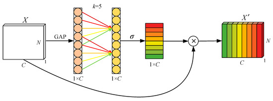 The channel attention mechanism has proven to have great potential for improving the performance of deep convolutional neural networks (CNN). Efficient Channel Attention (ECA) [28] is improved based on Squeeze-and-Excitation Attention (SEA) [29]. First, the ECA module aggregates convolution features using global average pooling (GAP) without dimensionality reduction. Second, kernel size k is determined adaptively. Then, a one-dimensional convolution operation is performed, and finally Sigmoid function was performed to learn channel attention. The diagram of the ECA is shown in Figure 2: