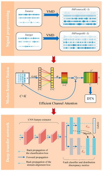 Transfer learning [12,13] improves the diagnostic performance of the diagnostic model in the target domain by learning relevant knowledge from similar scenarios. It provides a new way to solve the domain shift problem. When the data distribution of the source domain and the target domain is different, but the learning task is the same, the transfer learning in this scenario is called domain adaptation. Deep domain adaptation [14,15] combines the powerful feature extraction capability of deep learning. It can effectively learn the domain-invariant representation features of data and enhance the performance of diagnostic models in the target domain. Lei et al. [16] proposed a deep convolutional transfer learning network to explore intelligent fault diagnoses for machines with unlabeled data. The maximum mean difference (MMD) [17] domain discriminator was used to optimize the model and improve accuracy. Jiao et al. [18] proposed a residual joint domain adaptive adversarial network model. Joint maximum mean difference (JMMD) and adversarial domain adaptive discriminator are introduced to align the source and target domain feature spaces. However, the performance of these methods in noisy scenarios needs to be verified. Based on this problem, signal preprocessing in the feedforward network is one of the options for denoising. Qian et al. [19] proposed an unsupervised transfer learning model for a convolutional autoencoder. The Autoencoder is used to denoise the signal. However, the output of the autoencoder is lossy. The removal of noise will also remove some useful weak signals. Li et al. [20] thought from the perspective of a frequency domain. A frequency-domain fusion convolutional neural network for domain adaptive fault diagnosis is proposed. It provides an example adaptation network design for the unified domain but extracting frequency characteristics directly from the CNN still cannot be fully interpreted. Ben Ali et al. [21] proposed an automatic bearing fault diagnosis method based on empirical mode decomposition (EMD) to successfully detect the severity of defects online. However, determining the intrinsic mode functions (IMFs) best suited for bearing fault diagnosis requires expert experience. DASENet achieves high accuracy with few input data points [22]. The inputs to this model are the frequency domain signal and the time-frequency graph signal. In addition, it fuses features through the squeeze-and-excitation attention (SEA) module, which improves the generality of the diagnostic model. Nevertheless, this method incorporates the features of duplication and is not a transfer diagnostic model. Wu et al. [23] introduced ensemble empirical mode decomposition (EEMD) signal preprocessing and attention mechanisms into the transfer diagnosis model to extract domain-invariant features. In their study, the signal preprocessing part is just a function of denoising. In addition, the diagnosis results are effective, indicating that signal preprocessing is necessary. Although the above methods integrate signal preprocessing technology into deep learning or transfer learning methods to improve the performance of diagnostic models, there are still several open questions, and the following situations should be considered.