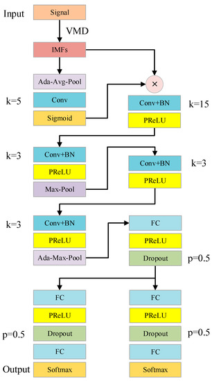 In this subsection, the specific architecture of the proposed method will be explained in detail. Inspired by a deep transfer network with joint distribution adaptation, the proposed deep transfer network architecture is designed based on VMD and ECA. The detailed architecture of the proposed method is shown in Figure 4. In a general way, the nonlinear correction unit function Parametric Rectified Linear Unit (PRELU) [30] is adopted for the nonlinear activation layer. Given a signal length of 1024 for a single sample, the input shape of the original vibration signal is (64, 1, 1024). 64 indicates the batch size, and 1 indicates the channel size. Set the number of modes of the VMD algorithm as 5, because the length of the mode component obtained after VMD decomposition is consistent with the original signal, the shape of the IMF signal is (64, 5, 1024). To fuse mode features more effectively, the ECA is used to learn channel attention. The ECA block consists of an adaptive global average pooling layer (Ada-Avg-Pool), a convolution layer (Conv), and a sigmoid layer. In addition, there is a weight multiplier at the end. Notably, it does not reduce dimension and effectively captures information about cross-channel interactions. The shape of the signal does not change as it passes through the ECA module, which simply re-weights the mode’s features. Next is the CNN feature extractor, which consists of four convolution layers containing batch normalization (BN). The convolution kernel size of these convolution layers is 15, 3, 3, and 3, respectively. In particular, the reason for using large convolution kernels in the first layer is to increase the receptive field. Inspired by Alexnet, max pooling (Max-Pool) is adopted for the second convolution layer, and adaptive global max pooling (Ada-Max-Pool) is adopted for the fourth convolution layer. To prevent overfitting, we use the dropout trick in the later fully connected layers (FC) as an alternative form of regularization. Set the dropout ratio to p, where each output node is set to zero with probability p. In addition, the architecture of the fault classifier and the distribution discrepancy metrics is similar. The specific parameters of the proposed network architecture are shown in Table 1.