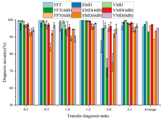- At the same noise level, the FFT preprocessing method has the worst performance, while the VMD preprocessing method has the best performance. Although the VMD preprocessing method is not optimal in individual transfer diagnosis tasks (such as 0-2 transfer diagnosis task without adding noise), the VMD preprocessing method has the highest cross-domain diagnosis accuracy in most transfer diagnosis tasks as a whole. The results show that VMD preprocessing can provide better anti-noise and robustness for intelligent fault diagnosis models.