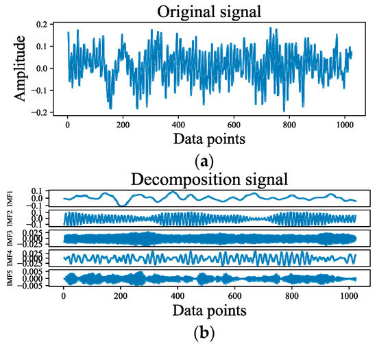 - EMD [35]: EMD (Empirical Mode Decomposition) is a signal processing method in the time-frequency domain, which is based on the time-scale characteristics of the data itself, without setting any basis function in advance. EMD has obvious advantages in processing non-stationary and nonlinear data and is suitable for analyzing nonlinear non-stationary signal sequences with a high signal-to-noise ratio.