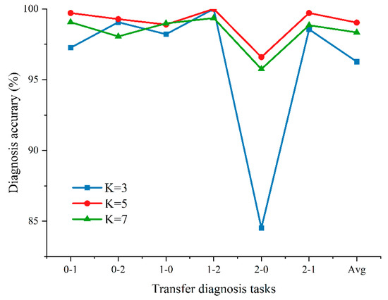 Based on the above two points, it can be concluded that the VMD preprocessing method has a beneficial effect on neural network learning fault features. The original signal, decomposition signal, and signal center frequency are shown in Figure 6. This shows that the different modes of decomposition represent the different central frequency characteristics of the fault signals. Decomposition of the signal will be more conducive to intelligent model learning and will play a role in noise reduction. Notably, the number of modes K is a hyperparameter. The effect of VMD decomposition is mainly affected by the selected value of the modal number. When the selected value of the mode is small, since the VMD algorithm is equivalent to an adaptive filter bank, some important information in the original signal will be filtered, affecting the subsequent feature extraction. When the selected value of the mode is large, the center frequencies of the adjacent mode components will be close to each other, resulting in mode repetition or additional noise. The main difference between the different modes is the difference in center frequency. Therefore, the appropriate mode value is selected by observing the distribution of the center frequency under different mode numbers. We set K equal to 5 by this method. In addition, we conducted some experiments on different hyperparameters K, as shown in Figure 7. This indicates that the VMD algorithm needs an appropriate K setting.