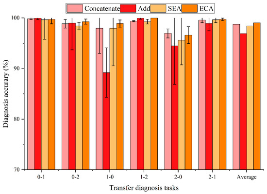 How to fuse the decomposed mode signal features is a difficult problem. After the original signal decomposition, each mode represents the fault features of different central frequencies. The aim of adding channel attention mechanisms to the intelligent fault diagnosis model is to reweight and fuse different mode features. This means that the transfer learning fault diagnosis network automatically learns which modes are more important to the final objective optimization. To illustrate the effectiveness and advantages of the proposed ECA feature fusion method in the whole intelligent fault diagnosis framework, popular feature fusion methods are compared. Notably, all comparison methods are consistent with the rest of the framework, except for feature fusion. We used Concatenate, Add, SEA, and ECA (the attentional mechanism we use in the proposed transfer learning framework) to conduct experiments for comparison. The experimental results are shown in Figure 8 and Table 5.