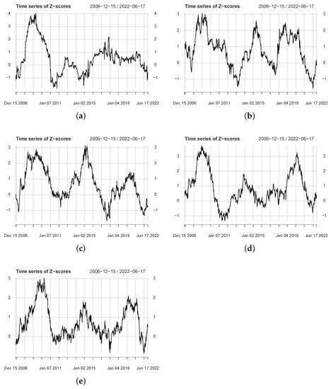 We set five sets of parameters () and , where the calculation window corresponds to two years of trading weeks. The five subfigures of Figure 1 show the Z-score time series. We observe that all subfigures include local peaks larger than 1.645, implying non-trivial information flow dynamics between series. These peaks correspond to periods of localized strong information flow. For example, for Figure 1a, it can be seen that the Z-score increased rapidly in 2008 and dropped significantly thereafter. Furthermore, we can also observe that the number of peaks in all Z-score series is greater than 1. For example, three localized peaks can be observed in Figure 1b, implying the existence of three periods of strong information flow.