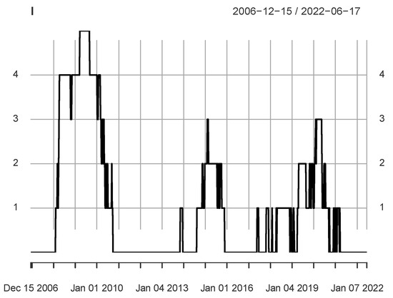 Figure 2 shows the I series. There are three periods where most observations are greater than or equal to 1. In particular, the analysis shows that there is a period where most observations are greater than or equal to 3, that is, 8 February 2008–24 September 2010. During the 2008–2009 crisis in the US market, there was strong information flow . We use to represent the number of observations equal to i in the I series, as shown in Table 4. It can be found that if the calculation results of 5 parameters are integrated, nearly half of the observations are greater than or equal to 1. This implies that information flows widely exist between the two markets during the period under consideration. Table 5 lists the three periods identified by Figure 2. Each period includes some major events that affect the market. The first period corresponds to the 2007–2009 crisis in the US market. The second period includes the crisis in the Chinese stock market in 2015. In addition, before the stock market crash in 2015, the bubble was generated in the second half of 2014. The second period not only includes the breakage period of the bubble, but also the generation period. The third period includes a series of major events, such as the circuit breaker in the US market in March 2020, and the COVID-19 pandemic. Based on this table, we divide three periods for the analysis of daily data in the next section: 2007–2010, 2014–2017, and 2008–2021.