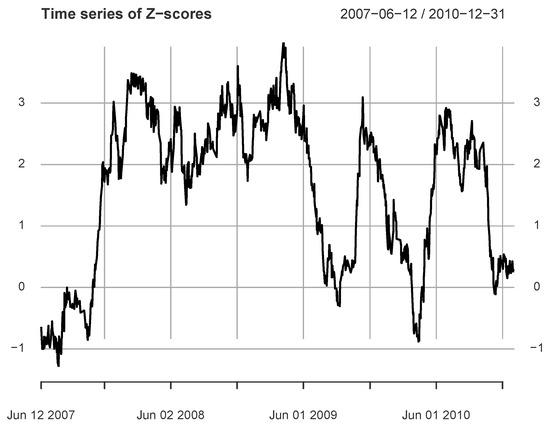 Figure 3 shows the Z-score series for the 2007–2010 data. If the threshold is 1.645, the series includes three significant periods: 26 November 2007 (28 June 2007)–25 June 2009, 28 October 2009 (1 June 2009)–8 January 2010, and 24 May 2010 (21 December 2009)–19 October 2010. Here, the date in parentheses is the left endpoint of the calculation window for the first Z-score greater than 1.645 within the period. In particular, the maximum value (3.9880) is in the first period and the calculation window is 3 November 2008–7 April 2009.