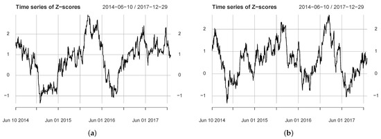 The figure shows the Z-score time series between and , where (a,b) correspond to parameters and , respectively.