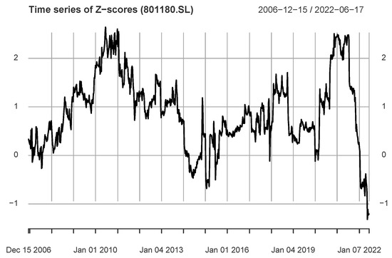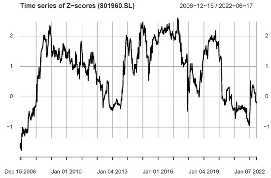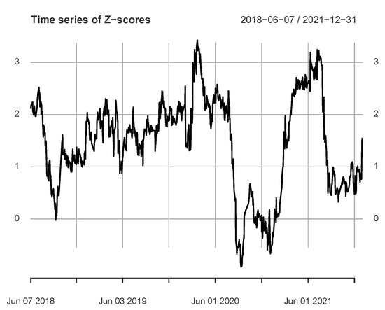 Figure 7 presents the Z-score series for the S&P500 Index → Real estate Index. For this Z-score series, there are only 124 values greater than the critical threshold. It shows a different pattern from Figure 6, such as observations in the period 4 September 2020 (26 October 2018)–16 July 2021 contribute significantly to the information flow. In addition, another major peak corresponds to the period 25 December 2009 (15 February 2008)–24 June 2011.