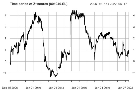 We analyze dynamics using weekly data and always set and weeks. Figure 6 shows the dynamics of information flow for . The Z-score series includes 794 values, and 396 values are greater than the critical threshold, implying that there is a continuous flow of information during the period. In addition, it includes several local peaks, and the corresponding periods of the two main peaks are 18 April 2008 (2 June 2006)–15 April 2011 and 24 October 2014 (21 December 2012)–30 June 2017, respectively.