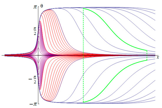 Ratio (10) describes the dynamics of magnetization reversal of the entire film with the exception of the points lying on the half-line φ = π. Let us investigate the behavior of the angle θ in the vicinity of this half-line, specifically, on the two closely located parallel lines r sin φ = ±h, h = const. Figure 1 shows the dependence of θ on the coordinate x = –r cos φ on the lines at successive moments of time t, and, notably, the time lapse between subsequent blue curves θ(x) is 10 times greater than that between subsequent red ones, which in its turn is 10 times greater than the time lapse between subsequent violet curves θ(x). It can be seen from the figure that the magnetization reversal process breaks down into two stages. Initially (violet and red curves), a magnetization reversal nucleus forms near the conductor rather quickly within which θ varies from 0 to ±π and back. Going forward, however, the right-side part of the nucleus starts moving away from the conductor (blue curves), roughly preserving its shape. At any moment of time, this right-side part happens to be localized in a small part of the space, to which the –1 topological charge is related (see, for instance, the area in Figure 1, which is bounded by the green dashed lines), and consequently this right-side part can be identified with some quasiparticle. The left-side part of the nucleus, in a similar manner, can be identified with a fixed quasiparticle which carries the +1 topological charge. In these terms, the first stage of the magnetization reversal represents an origination of a pair of quasiparticles in the antidot area, whereas the second one is an emission of one of them, which, while gradually moving off to infinity, takes the −1 topological charge away with it, thanks to which there happens a change of the sample’s topology in general.