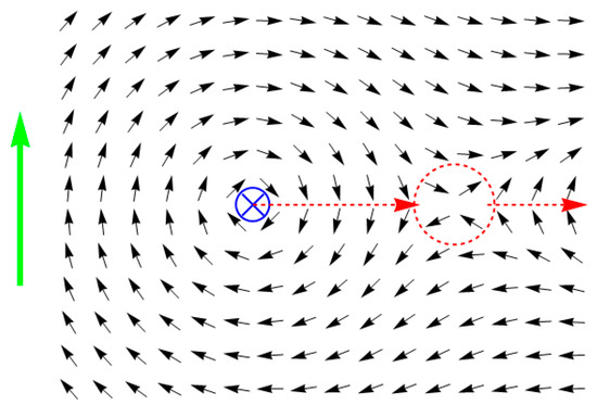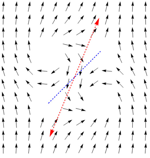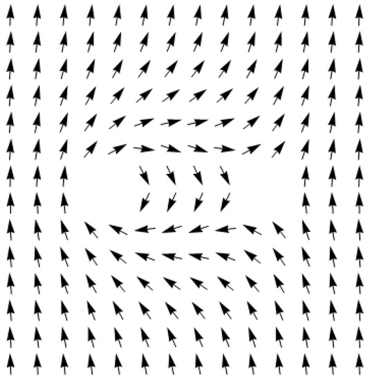 where the first summation is performed over all of the pairs of lattice points which are the nearest neighbors, horizontally or vertically, and ri, φi are the coordinates of the lattice point related to the spin, with the orientation determined by angle θi. Therefore, the first term in Formula (11) corresponds to the exchange interaction (generally speaking, it should also include a factor characterizing the intensity of interaction; nevertheless this factor can always be made equal to the value of 1 along with β in Equation (6) by selecting the appropriate units), whereas the second term describes the impact of the external magnetic field (I/ri and φi represent its magnitude and direction respectively) which is produced by the current I. Then the solution of the motion Equation (6) (the initial state is set to θi = 0: the magnetization distribution is initially homogeneous) corresponds to the magnetization reversal process, which is accompanied by an emission of a quasiparticle generated by four spins as shown in Figure 2 (only a part of the lattice is shown for the sake of clarity). After this quasiparticle leaves the model’s borders, all the spins end up oriented along the concentric circles, and the reverse magnetization process is completed.
