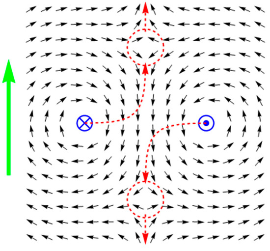 As shown before, switching on a current in the filament passing through the hole leads to the nucleation of a quasiparticle with the topological charge +1, whereas the quasiparticle with the −1 charge is emitted in the direction which depends on the initial direction of magnetization in the sample. This scenario can be successfully used as a tool to analyze more complex situations, for example, when there is more than one hole in the sample. For instance, let the number of holes be equal to two, and magnetization in the homogeneous state of the sample is directed at the angle of π/4 to the line, which connects their centers. If the current is applied in one direction through both of the holes, two quasiparticles with −1 charges will be emitted. Let us point out, however, that neither of the particles can further move to infinity: in this case, the total topological charge of the sample would become +2, though, at a large distance from the holes, the two currents should be indistinguishable from one other and, therefore, the total charge (as in the case of a single conductor) imperatively equals +1. It follows that one of the emitted quasiparticles will actually never leave the sample area. This conclusion is effectively confirmed by a numerical experiment. Considering the discrete model comprising 392 spins with the energy similar to (11), we observe that the quasiparticle emitted by one of the holes changes the direction of its motion in practically no time and comes to a stop exactly between the holes, thanks to which a static structure emerges with the total topological charge of +1 (see Figure 3).