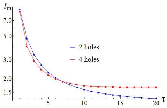 Dependence of the minimal current strength Im on impulse duration τ. The blue line corresponds to the case of the two-hole cell, while the red line corresponds to the four-hole one.
